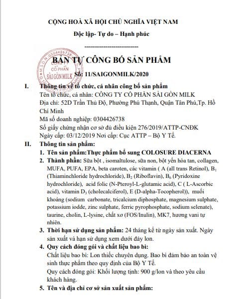 1. Tên sản phẩm:Thực phẩm bổ sung COLOSURE DIACERNA