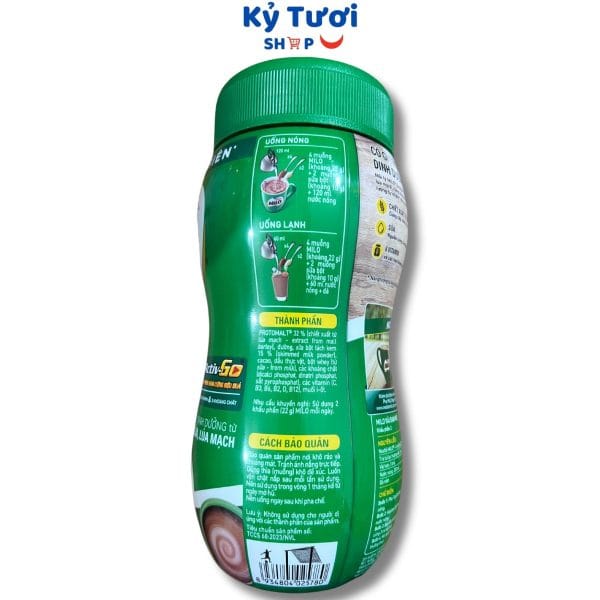 | Cách sử dụng | Uống nóng: 4 muỗng Milo (khoảng 22g) + 2 muỗng sữa bột (khoảng 10g) + 120ml nước nóng. Uống lạnh: 4 muỗng MILO (khoảng 22g) + 2 muỗng sữa bột (khoảng 10g) + 60ml nước nóng và đá. |
