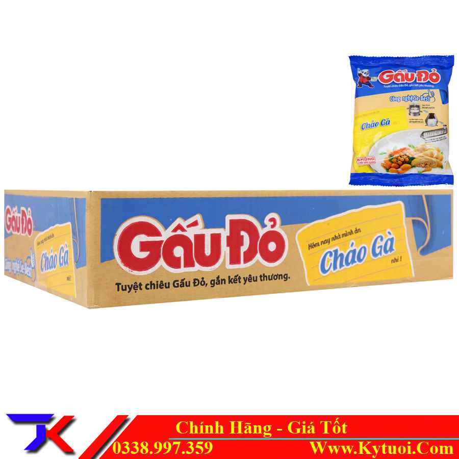 THÀNH PHẦN:(Cháo Gấu Đỏ Vị Gà được chế biến 100% đặc sản gạo thơm nguyên chất với thành phần gạo nàng thơm chợ đào. Thành phần dinh dưỡng: Năng lượng tổng: 271Kcal Trong đó: Chất béo 11g, Carbonhydrate 37g, Protein 6g)